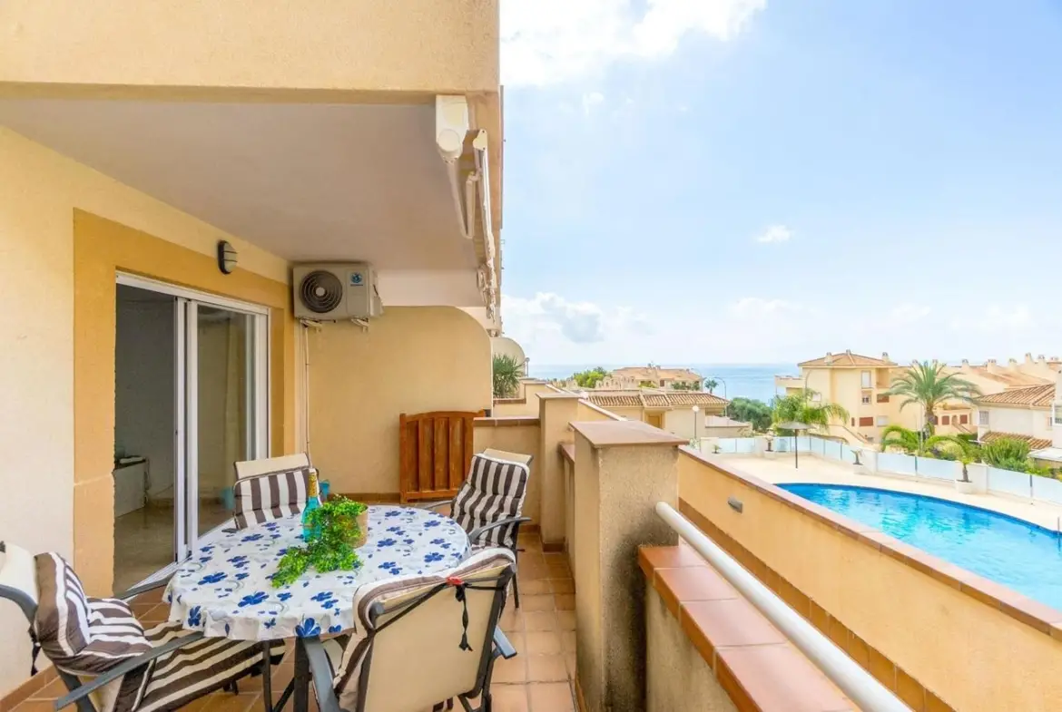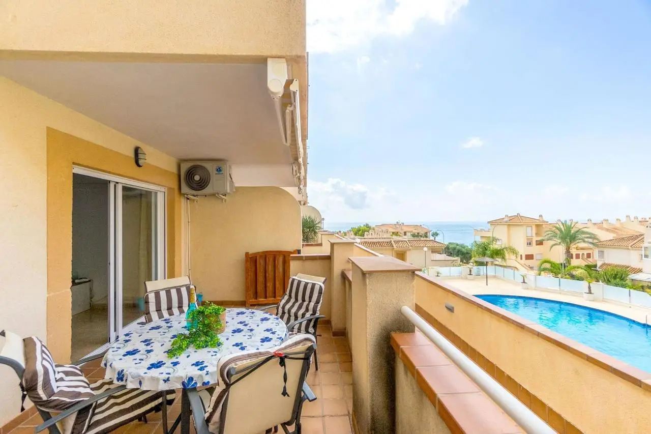 Zuid georiënteerd gelijkvloers appartement met 2 slaapkamers in Cabo Roig, Alicante met uitzicht op het zwembad en de Middellandse Zee.