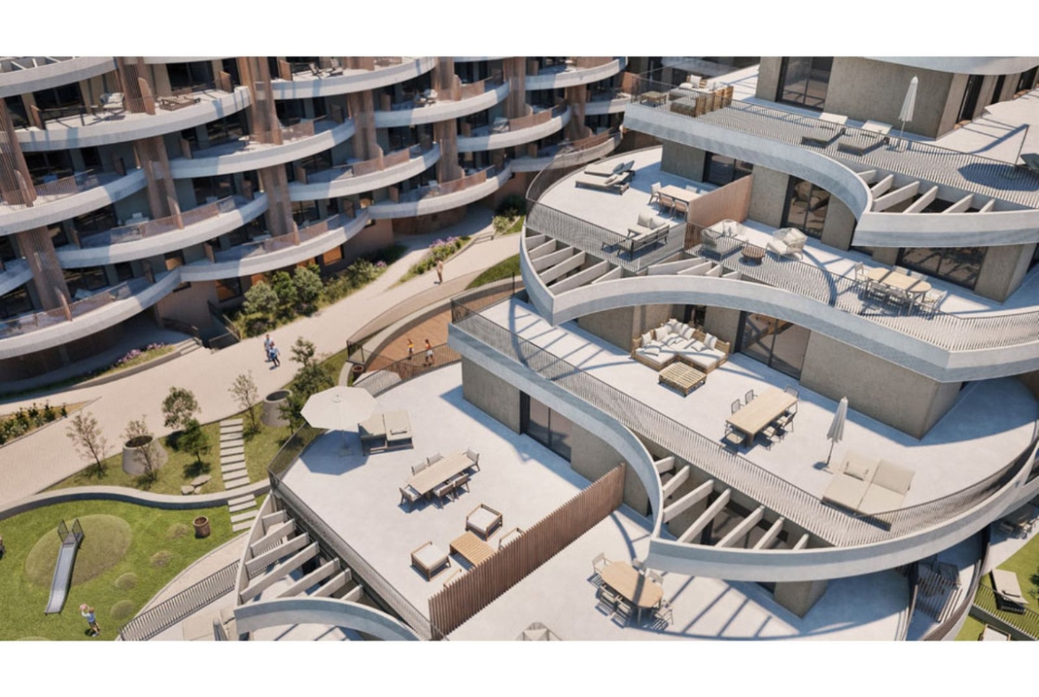De ontwikkeling bestaat uit 165 appartementen met 1 tot 4 slaapkamers, verdeeld over vijf verdiepingen. De woonoppervlakten variëren van ongeveer 70 m² tot 193 m², met praktische indelingen en goed proportioneerde woonruimtes. Alle appartementen beschikken over lichte woonkamers met open keukens, volledig uitgerust met moderne apparaten. Dankzij grote ramen en dubbele oriëntatie profiteren de woningen van overvloedig natuurlijk licht en effectieve kruisventilatie. Afhankelijk van het type appartement zijn er een of meerdere badkamers, royale slaapkamers en kwaliteitsafwerkingen door het hele appartement. Begane grond appartementen hebben privé tuinen, appartementen op de middenverdieping hebben ruime terrassen, en penthouses zijn voorzien van privé solariums.