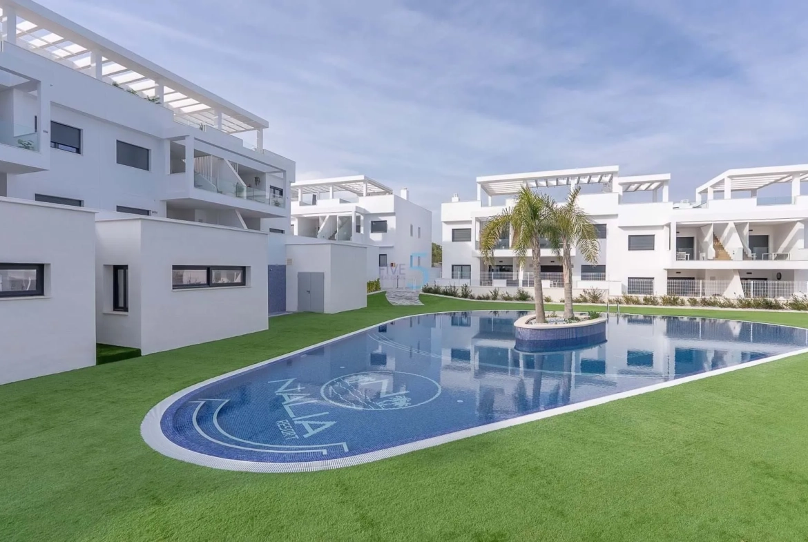 This stunning two-bedroom, two-bathroom ground-floor apartment is located within the newly built Nalia complex, which boasts impressive communal facilities including secure underground parking, beautifully landscaped gardens and a swimming pool with a jacuzzi. The apartment has never been lived in and is presented in completely brand-new condition. It features two double bedrooms, two modern bathrooms, and private terrace spaces at both the front and rear of the property.