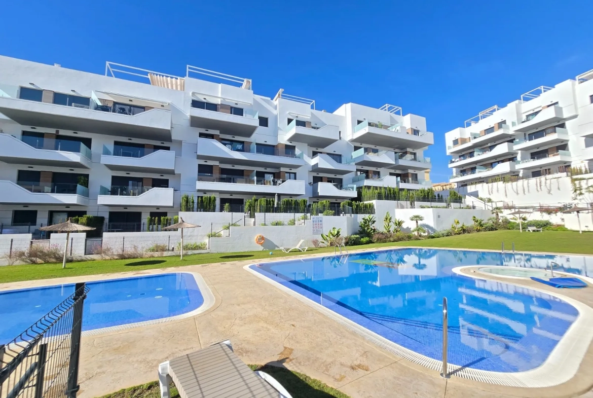 Moderne begane grond woning in Villamartin Eigentijds en comfortabel wonen Ontdek dit moderne appartement, slechts twee jaar oud, gelegen in een van de mooiste urbanisaties van Villamartin, Orihuela Costa. Deze ruime woning op de begane grond biedt een ideale combinatie van comfort en stijl. Interieur en voorzieningen De woning beschikt over twee slaapkamers en twee moderne badkamers, waarvan een en-suite. De open keuken is volledig uitgerust en vloeit naadloos over in de lichte woonkamer met directe toegang tot het ruime terras. Vanaf hier heb je direct toegang tot de prachtig aangelegde gemeenschappelijke tuin met een zwembad en jacuzzi, perfect om te ontspannen en te genieten van het mediterrane klimaat. Omgeving en locatie De urbanisatie is modern, uitstekend onderhouden en omgeven door veel groen, wat zorgt voor een rustige en aangename sfeer. Daarnaast heeft het appartement een ondergrondse garageplaats, wat extra gemak en veiligheid biedt. Uitstekende ligging Gelegen op een toplocatie in Villamartin, op korte afstand van winkels, restaurants, golfbanen en de stranden van Orihuela Costa, is dit appartement ideaal als permanente woning, vakantiehuis of investering.