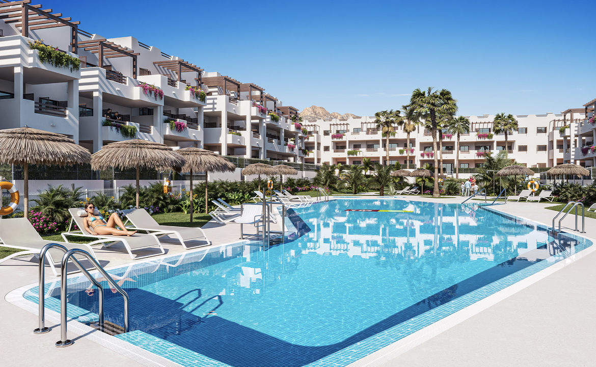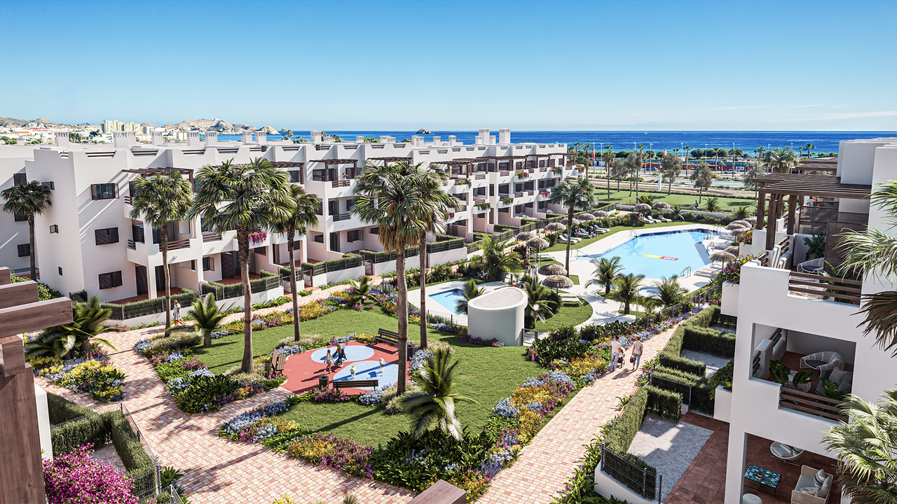 Nieuwbouwappartementen (366 in totaal) in Mar de Pulpi, Almería met 1, 2 en 3 slaapkamers, met vele gemeenschappelijke ruimtes zoals tuinen, gemeenschappelijke zwembaden, jacuzzi’s en kinderspeeltuinen. Gelegen op een rustige locatie in een bevoorrechte natuurlijke omgeving. Deze nieuwe fase biedt woningen die zijn ontworpen om te genieten van het mediterrane klimaat, de rust van de omgeving en het comfort van een gevestigde woonwijk met alle voorzieningen binnen handbereik. Het wooncomplex ligt zeer dicht bij de stranden van La Entrevista en Los Nardos, en op slechts enkele minuten van Águilas, Cala Cocedores en de golfbanen Aguilón Golf en Desert Spring Golf.