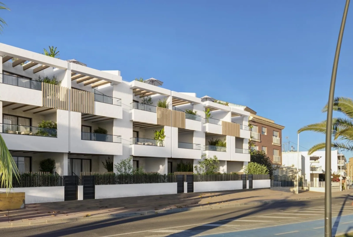 Nieuwbouw Residentie aan de Zee in San Pedro del Pinatar Gelegen in Lo Pagan aan de Mar Menor Lo Pagan, een plaats in Murcia, biedt een combinatie van natuurlijke schoonheid en culturele rijkdom. Op slechts 57 minuten van de luchthaven van Alicante, is deze kustplaats ideaal voor ontspanning en verkenning. Eigentijds Wonen met Moderne Voorzieningen De nieuwbouwresidentie beschikt over 1, 2 en 3-kamer penthouses en appartementen. De 21 eenheden zijn verdeeld over blokken van drie verdiepingen en ontworpen om veel natuurlijk licht binnen te laten. Elke woning biedt een moderne leefruimte die naadloos aansluit bij de kustomgeving. Uitgebreide Faciliteiten Geniet van het gemeenschappelijke zwembad, beveiligde ondergrondse parkeergelegenheid, en een gedeeld dakterras. Sommige woningen beschikken over een privéterras, terwijl zes penthouses directe toegang hebben tot een eigen solarium. Bewoners kunnen kiezen voor een buitenkeuken op het solarium. Ideale Locatie en Gemeenschapsvoorzieningen San Pedro del Pinatar ligt aan de Mar Menor en de Middellandse Zeekust, ideaal voor zeilen en watersporten. De omgeving biedt diverse activiteiten, zoals een overdekt zwembad, sportfaciliteiten en sociale activiteiten dankzij het milde klimaat. Lo Pagan heeft alle benodigde voorzieningen en ligt op slechts 5 minuten van winkelcentrum Dos Mares. De luchthaven van Murcia/Corvera is op 30 minuten afstand en de luchthaven van Alicante op een uur rijden.