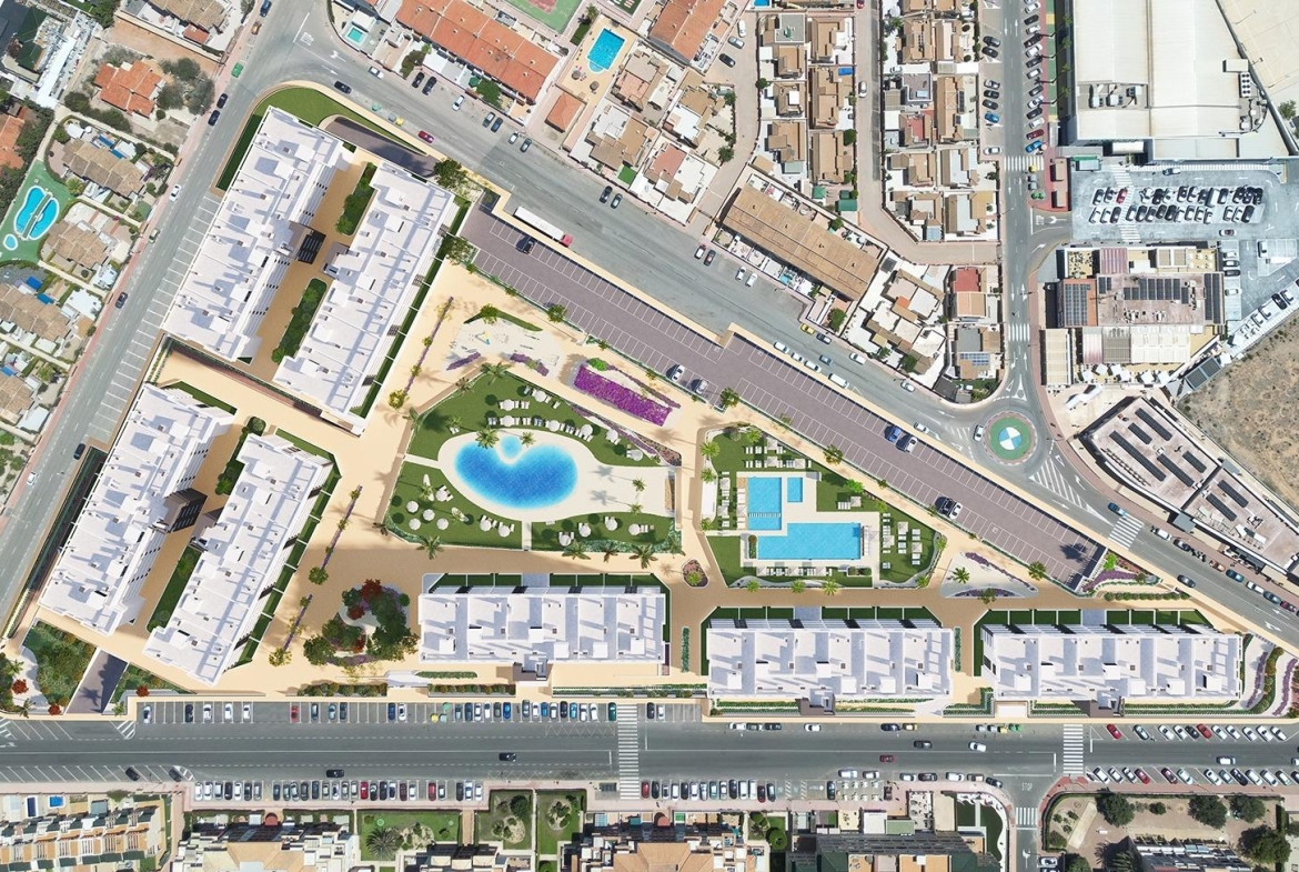 NEW BUILD GATED URBANIZATION IN TORREVIEJA ONLY 700M FROM THE BEACH New Build residential complex of 362 apartments with large community areas in Torrevieja. You can choose between luxury 2 bedrooms and 2 bathrooms apartments , 3 bedrooms and 2 bathrooms penthouses with private solarium and 2 bedroom, 2 bathroom ground floor apartments with private garden. -Modern designs and quality finishes and materials -Almost all apartments will have sea views -All apartments comes with large front terraces facing the community areas -Communal areas with two swimming pools for adults, children’s pool, children’s area, gym, sports area and spa, bicycle parking and vehicle parking area -700 meters to La Mata Beach, 10 minutes walking -In front of Torremarina Shopping Center with Mercadona, restaurants, cafes and other shops Torrevieja is a Spanish town in the province of Alicante, on the Costa Blanca. It is known for its typically Mediterranean climate and coastline. It has boardwalks with resorts along its sandy beaches. The small Museum of the Sea and Salt houses exhibitions on the fishing and salt history of the city. In the interior, the Lagunas de La Mata-Torrevieja Natural Park has trails and two salty lagoons, one pink and the other green. Alicante airport located 40 minutes away and Murcia airport about 1 hour away.