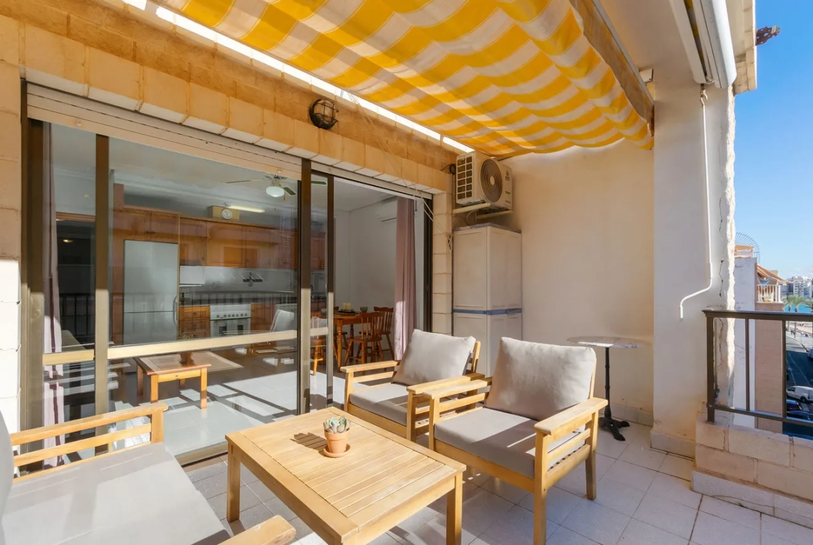 Appartement met Ruime TerrasDit appartement heeft een groot terras en ligt ideaal aan de strandpromenade van Torrevieja. Het bevindt zich op de vierde verdieping en heeft een oppervlakte van 55 vierkante meter.Indeling en VoorzieningenHet appartement beschikt over een brede gang, twee ruime slaapkamers, een badkamer en een woonkamer met open keuken. Vanuit de woonkamer is er toegang tot het terras met uitzicht op Playa del Cura. Deze woning wordt gemeubileerd verkocht, inclusief witgoed en airconditioning.Prijs en KostenDe vraagprijs bedraagt 159.000 euro, exclusief kosten. Het appartement heeft een gebruiksoppervlakte van 55,76 vierkante meter en is voorzien van inbouwkasten, zonneschermen en een lift. Het is gebouwd in 1991, heeft een zuidelijke ligging en de jaarlijkse onroerendgoedbelasting is 237,62 euro. De gemeenschappelijke kosten bedragen 139,31 euro per jaar en het energielabel is E/G.