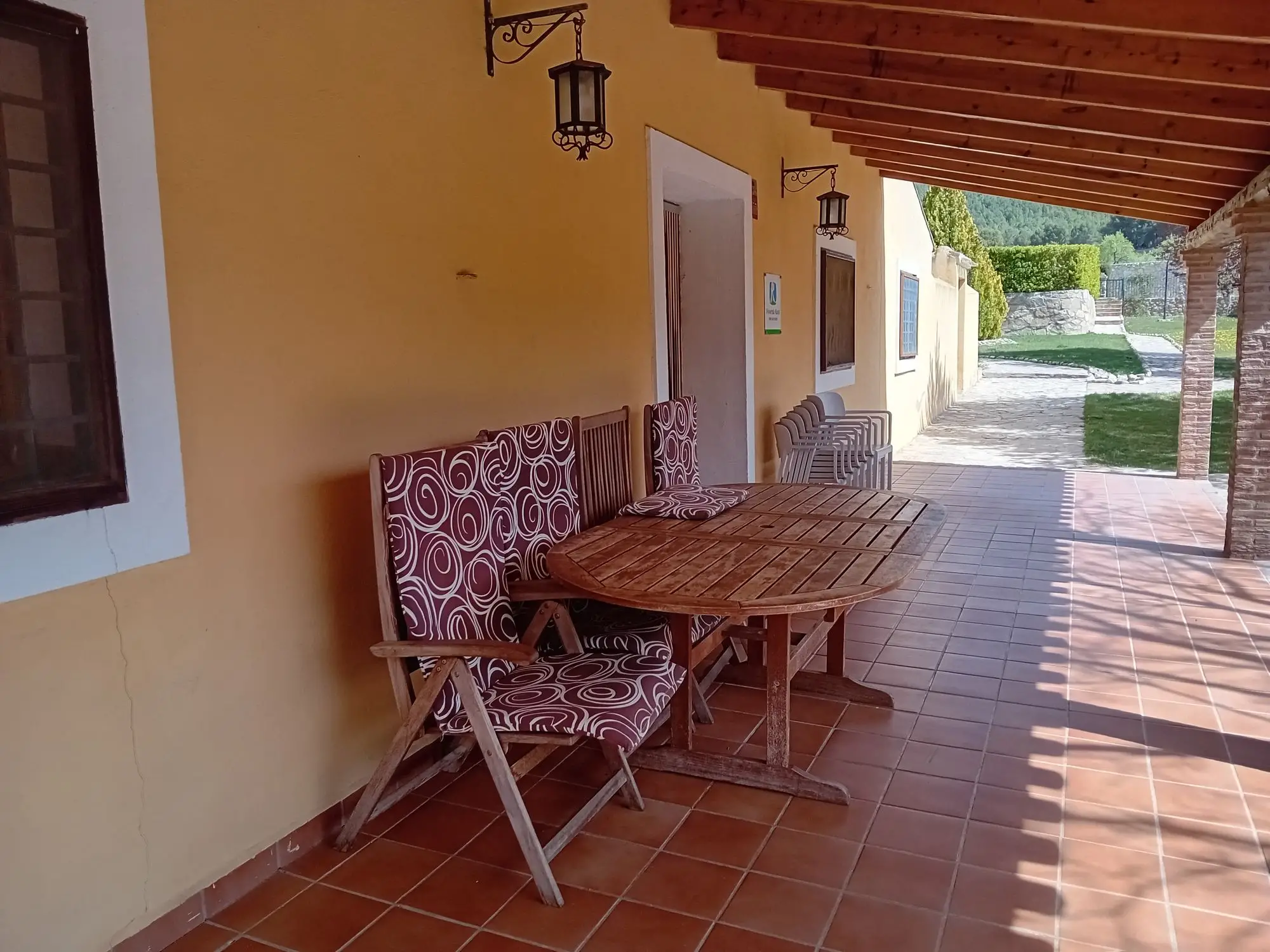 Aan de voorzijde van de woning bevindt zich een overdekte veranda, ideaal om te ontspannen tijdens de warme zomerdagen. Deze ruimte is perfect om familie en vrienden te ontvangen. Daarnaast vind je een afgesloten buitenkeuken met een gemetselde barbecue en een traditionele pizza-/broodoven.