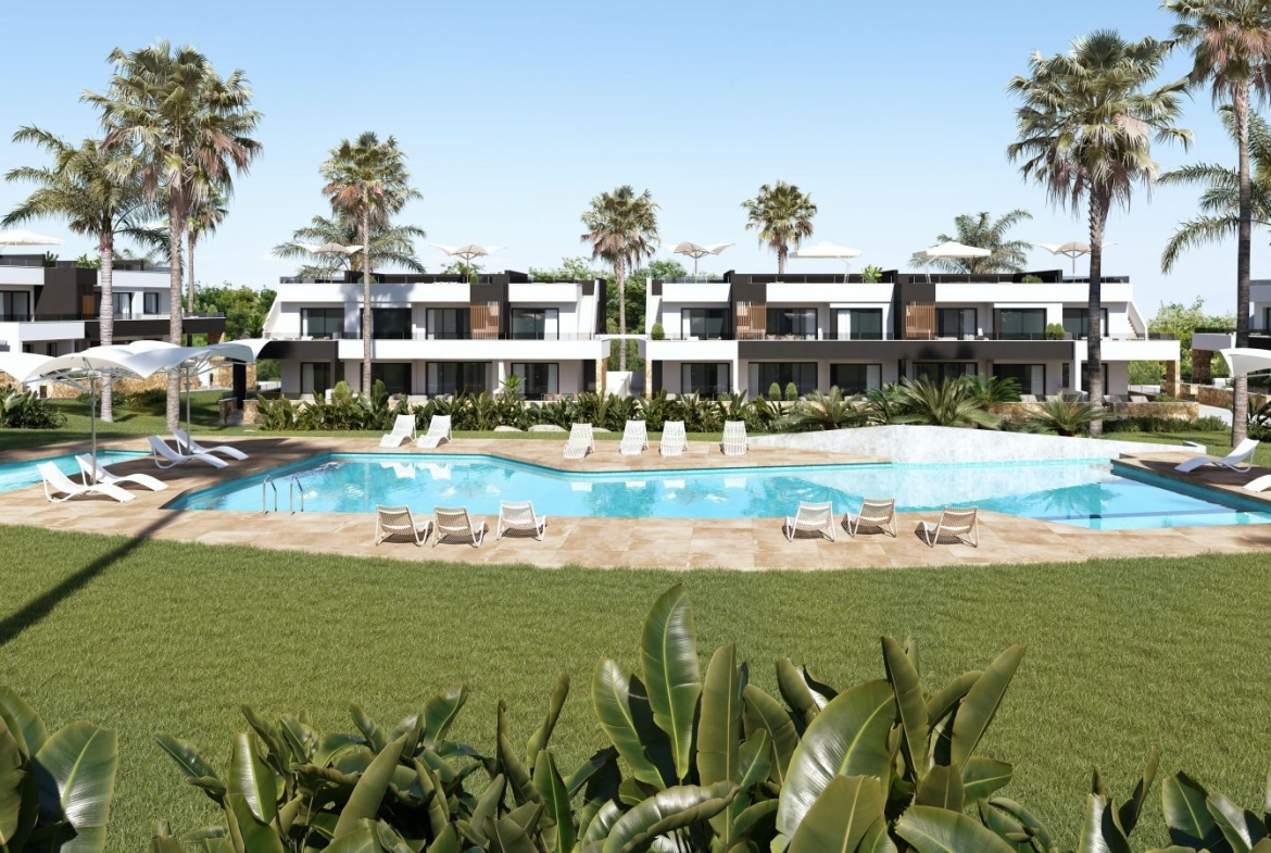 The residential complex is made up of 84 modern-style bungalows located in Lo Marabú. 2 bedrooms and 2 bathrooms distributed on one floor. Ground floor with garden or upper floor with private solarium.