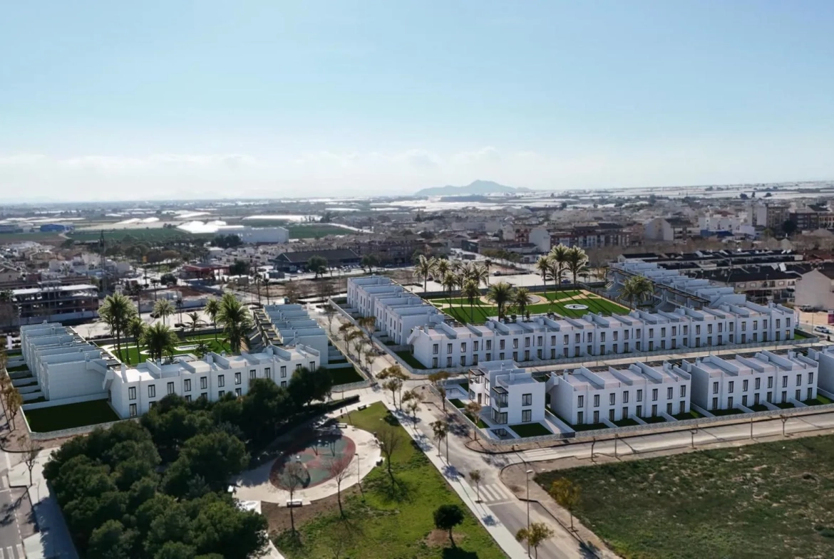Nieuwbouwwoningen in Pilar de la Horadada Moderne woningen vlakbij het strand Ontdek dit exclusieve nieuwbouwproject in Pilar de la Horadada, met bungalows en twee-onder-een-kapwoningen op minder dan 2 km van het strand. Deze woningen zijn ontworpen met het oog op comfort en stijl en bieden een uitstekende kans om te genieten van het leven aan de Costa Blanca. Ruime en stijlvolle woningen Dit project biedt woningen met 2 of 3 slaapkamers, 2 badkamers en een eigen parkeerplaats. U kunt kiezen uit: Bungalows op de begane grond met een eigen tuin. Bungalows op de bovenverdieping met een eigen solarium. Twee-onder-een-kapwoningen met kelder en ruime percelen. Elke woning is gebouwd met hoogwaardige materialen en moderne afwerkingen, waaronder: Airconditioning via luchtkanalen. Aluminium buitenschrijnwerk, dubbele beglazing en aluminium rolluiken. Veiligheidsdeur voor extra gemoedsrust. Aerothermisch systeem voor efficiënte warmwaterproductie. Inbouwkasten in de slaapkamers. Volledig uitgeruste badkamers met meubels en douchewanden. Exclusieve kenmerken van de gemeenschap Dit privé wooncomplex beschikt over een prachtig gemeenschappelijk zwembad en aangelegde tuinen, waardoor een ideale ruimte ontstaat om te ontspannen. Gelegen aan de rand van het stadscentrum, kunnen bewoners te voet naar supermarkten, restaurants, bars, scholen en andere essentiële voorzieningen. Beproevde locatie in Pilar de la Horadada Pilar de la Horadada is een charmant Spaans stadje in het zuidelijkste deel van de Costa Blanca. Het heeft een levendige hoofdstraat met talrijke winkels, supermarkten, restaurants en pittoreske pleintjes. De prachtige stranden van Torre de la Horadada en Mil Palmeras liggen op slechts 5 minuten afstand, met fijn goudkleurig zand en een pittoreske boulevard. De stad biedt ook goed aangelegde fiets- en wandelpaden en een breed scala aan sportieve activiteiten. Gemakkelijke toegang tot belangrijke bestemmingen Golfbaan Lo Romero – 5 km (10 minuten rijden). Luchthaven Corvera (Murcia) – 40 km (40 minuten rijden). Luchthaven Alicante – 55 km (55 minuten rijden). Winkelcentra (La Zenia Boulevard) – 15 km (15 minuten rijden). Jachthaven Torre de la Horadada – 3 km (5 minuten met de auto). Verzeker vandaag nog uw droomhuis Mis deze fantastische kans niet om een gloednieuwe woning op een bevoorrechte locatie te bezitten. Neem vandaag nog contact met ons op voor meer informatie en om een bezichtiging te regelen.