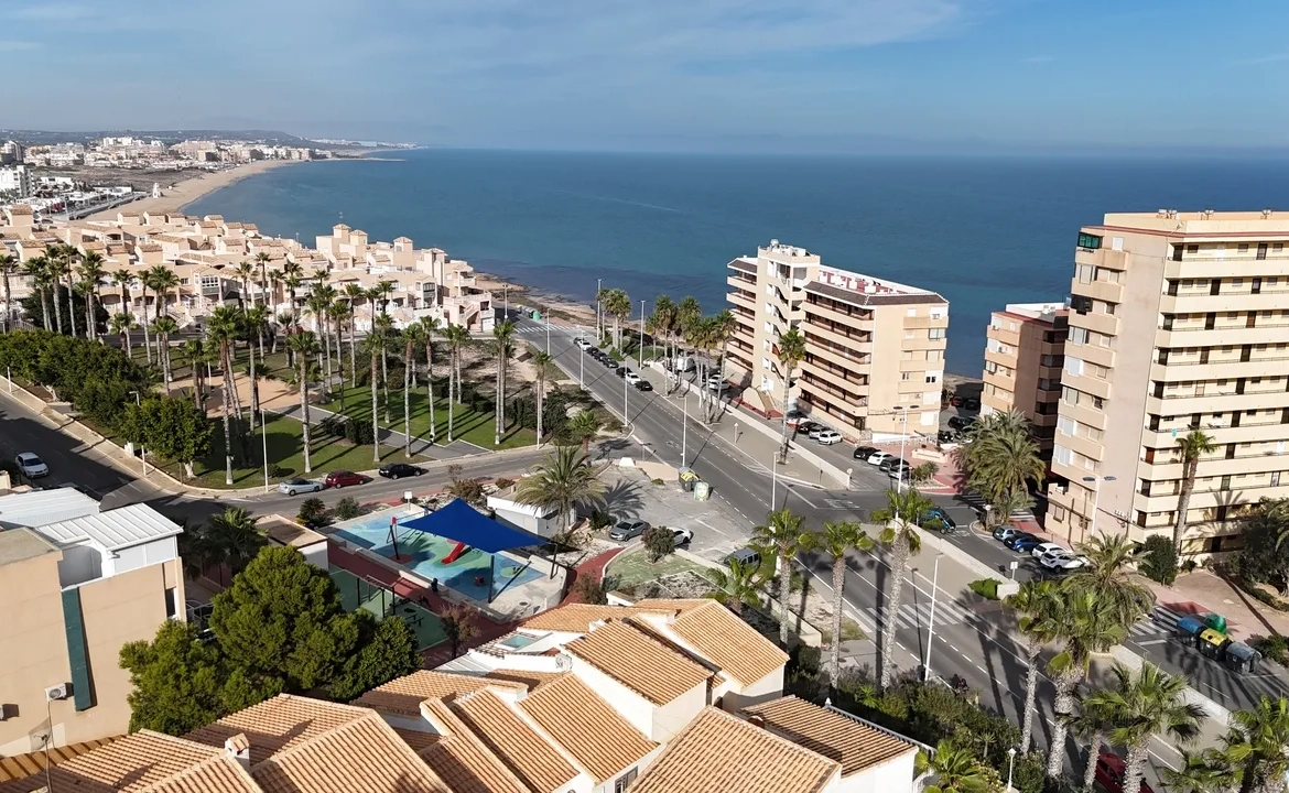 Uitstekende kans nabij La Mata strand Woning en locatie Deze duplex woning ligt op slechts 200 meter van het strand van La Mata. Het maakt deel uit van een gevestigde gemeenschap en is eenvoudig te bereiken. Restaurants, tapasbars en winkels bevinden zich binnen handbereik. De woning bevindt zich net binnen de poorten van de gemeenschap en beschikt over een eigen tuin en solarium. Indeling en uitzicht Via een trap komt u bij het appartement waar de woonkamer en eetkamer direct uitzicht bieden op de Middellandse Zee. De open keuken in Amerikaanse stijl, een tweepersoonsslaapkamer en de familie badkamer zijn aanwezig op deze verdieping. Extra faciliteiten Een trap leidt naar de tweede gastenslaapkamer met privétoegang tot het solarium en meer zeezicht. De woning wordt verkocht zoals getoond, met nieuwe apparaten in de keuken, airconditioning en een opslagruimte op de begane grond. Gemeenschap en voorzieningen ‘Residencial El Balon de Torreblanca’ is een goed onderhouden gemeenschap met mooie tuinen en een zwembad.