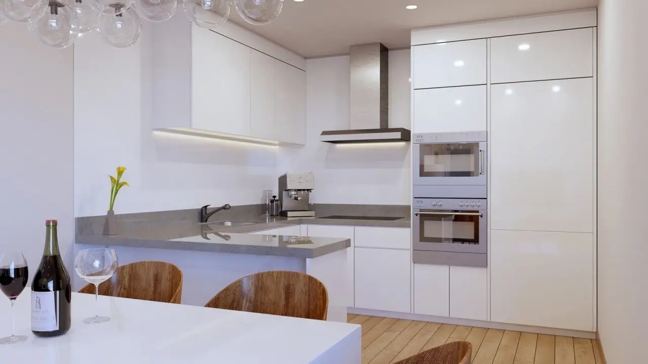 Ontworpen met een eigentijdse stijl en een open concept, bestaande uit een volledig uitgeruste keuken en een woon-eetkamer.