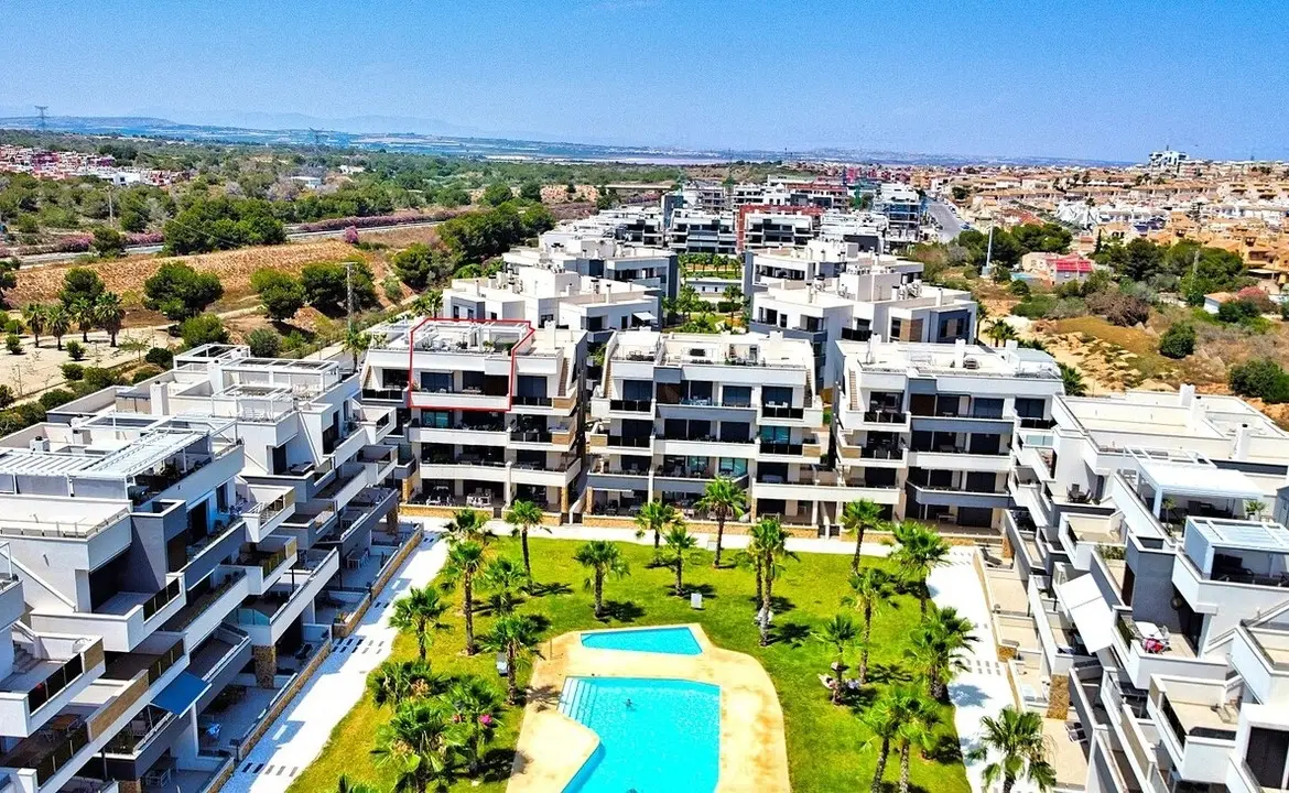 Prachtig Afgewerkt Appartement in Los Altos met Dakterras, Jacuzzi & Luxe FaciliteitenWelkom in dit stijlvol afgewerkte en deels gemeubileerde appartement in het populaire Los Altos (Orihuela-Costa) – een plek waar comfort, zon en buitenleven samenkomen.Gelegen in het moderne Amanecer IX-complex, geniet je hier van een privé dakterras, een ruim balkon en een eigen jacuzzi – het ultieme mediterrane leven aan de Costa Blanca.Slim Ontworpen & ComfortabelDe woning van circa 71 m² beschikt over 2 comfortabele slaapkamers en 2 stijlvolle badkamers. Dankzij het Airzone-systeem regel je per kamer eenvoudig de temperatuur voor een optimaal binnenklimaat.Licht & RuimteDe lichte woonkamer sluit naadloos aan op de moderne open keuken en het zonnige balkon van 21 m².Het echte wow-moment beleef je op het privé solarium van bijna 80 m², voorzien van twee pergola’s met zijpanelen – voor schaduw, privacy en sfeer, het hele jaar door.Geniet hier van ultieme ontspanning in je eigen jacuzzi onder de pergola.Instapklaar & Gedeeltelijk GemeubileerdHet appartement wordt deels gemeubileerd aangeboden: stijlvolle binnenmeubels, accessoires en praktische items blijven achter – direct klaar om in te trekken.Luxe Gemeenschappelijke VoorzieningenBewoners van het complex beschikken over een zwembad, fitnessruimte en sauna – alles binnen handbereik voor een ontspannen, gezonde levensstijl.Toplocatie in Los AltosLos Altos staat bekend om zijn rustige sfeer, goede voorzieningen en nabijheid van stranden, winkels en restaurants. Een perfecte combinatie van comfort, ruimte en mediterrane charme.Een unieke kans voor wie het beste van de Costa Blanca wil beleven – met zon, luxe en privacy, elke dag opnieuw.