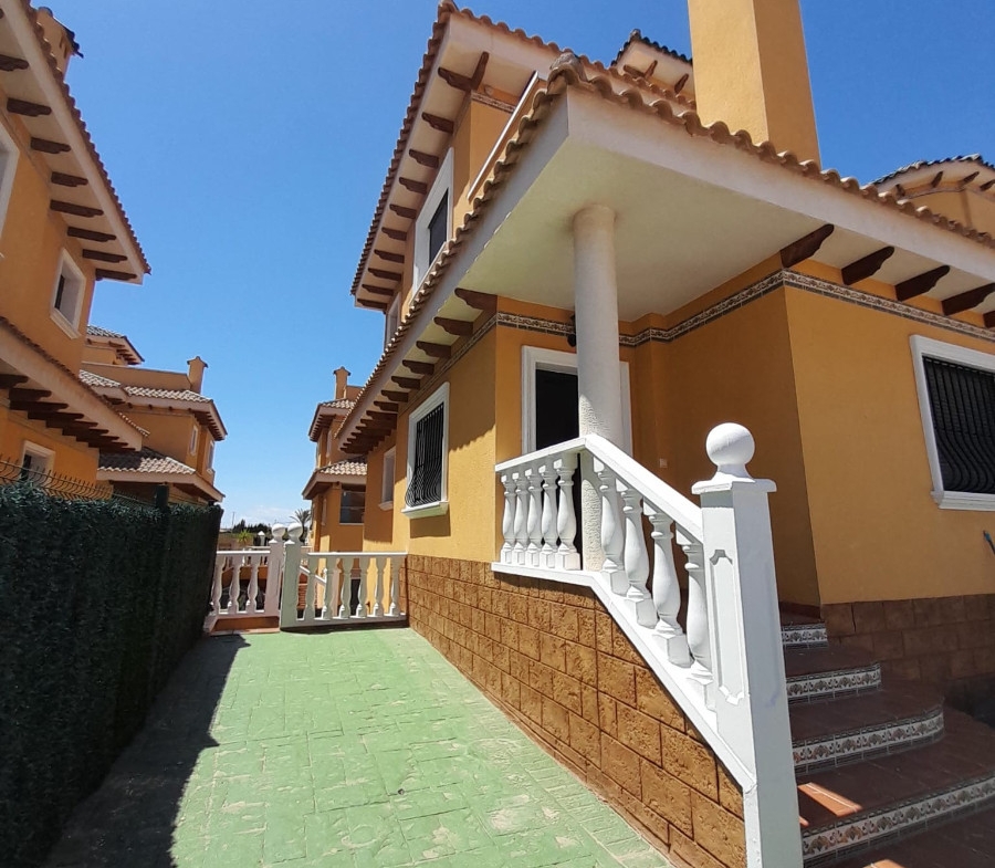 Unfurnished detached chalet with 3 bedrooms and a spacious basement (kitchen available in another property for an additional €10,000). Equipped with 2 air conditioning units (one in the living room, one in a bedroom), an enclosed gallery with sliding window, solarium, and access to a community pool. Located in a popular area of Ciudad Quesada, within walking distance of all services. Sold as is.