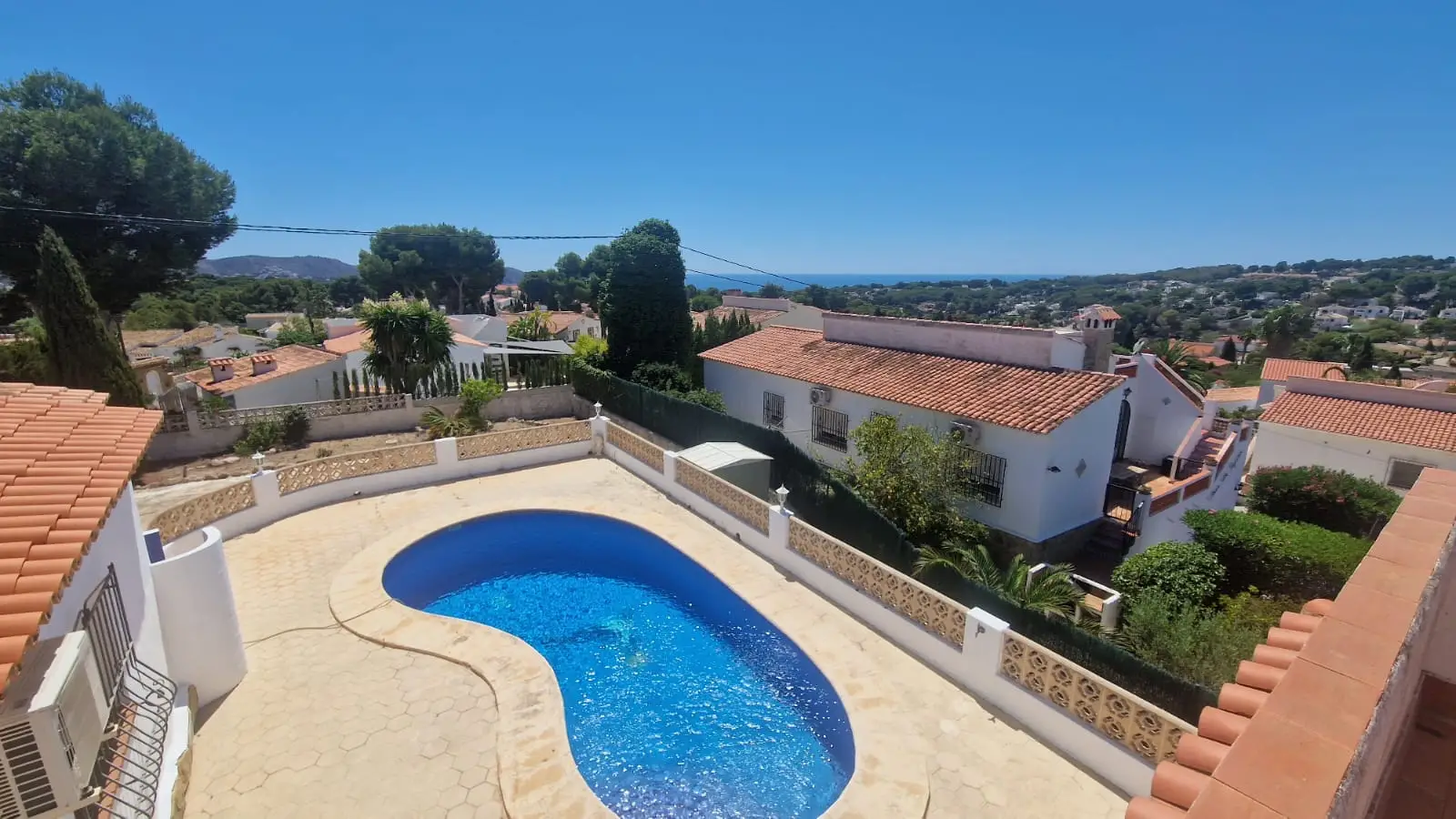Deze villa, gebouwd in 1978, staat op een hoekkavel van 787 m². Het is een woning die veel aspirant-kopers zal aanspreken: alle kamers bevinden zich op hetzelfde niveau als het zwembad en het ruime betegelde terras. Er is een aangename indeling met drie slaapkamers en twee badkamers, zodat gasten of gezinsleden hun eigen plek hebben. In de zomer zorgt de airconditioning voor een aangenaam klimaat, en de garage biedt niet alleen parkeergelegenheid, maar ook extra ruimte voor opslag of hobby’s.