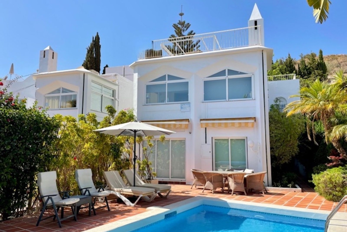 Beautiful detached villa with private pool and access to a large communal pool and garden. Located in urbanization Alhambra, a few minutes from the center of Nerja and Burriana Playa.
