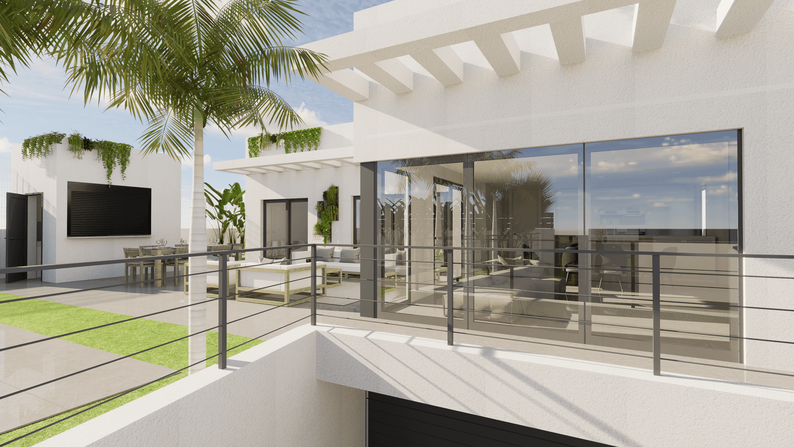 Op de begane grond vind je een stijlvolle keuken, eetkamer en woonkamer, samen met 2 slaapkamers en 2 badkamers, allemaal voorzien van vloerverwarming. Tegen een meerprijs kan er een solarium op het dak worden gebouwd, wat een prachtig uitzicht op de zee biedt.
