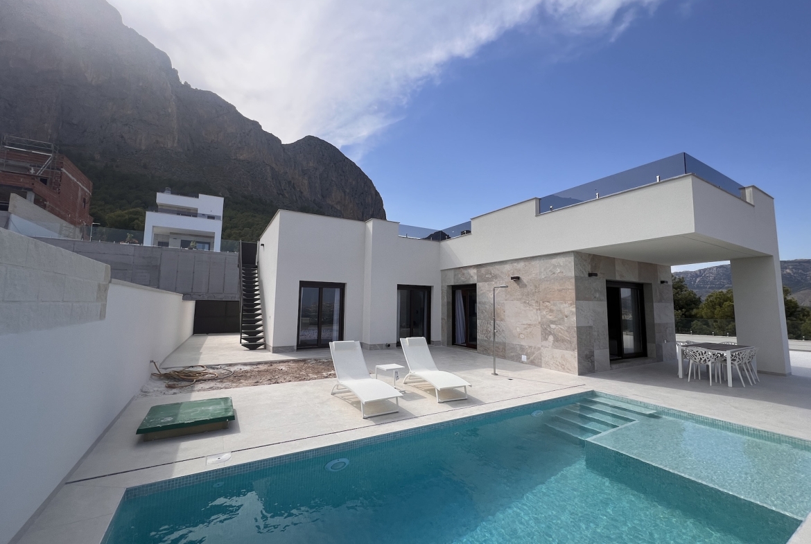 Moderne nieuwbouwvilla met zeezicht en privézwembad te koop in Polop, aan de voet van de indrukwekkende Ponoig-berg. Deze stijlvolle woningen combineren rust, natuur en privacy met modern comfort en een uitstekende bereikbaarheid, waardoor ze perfect zijn als permanente woning, tweede verblijf of waardevaste investering aan de Costa Blanca.