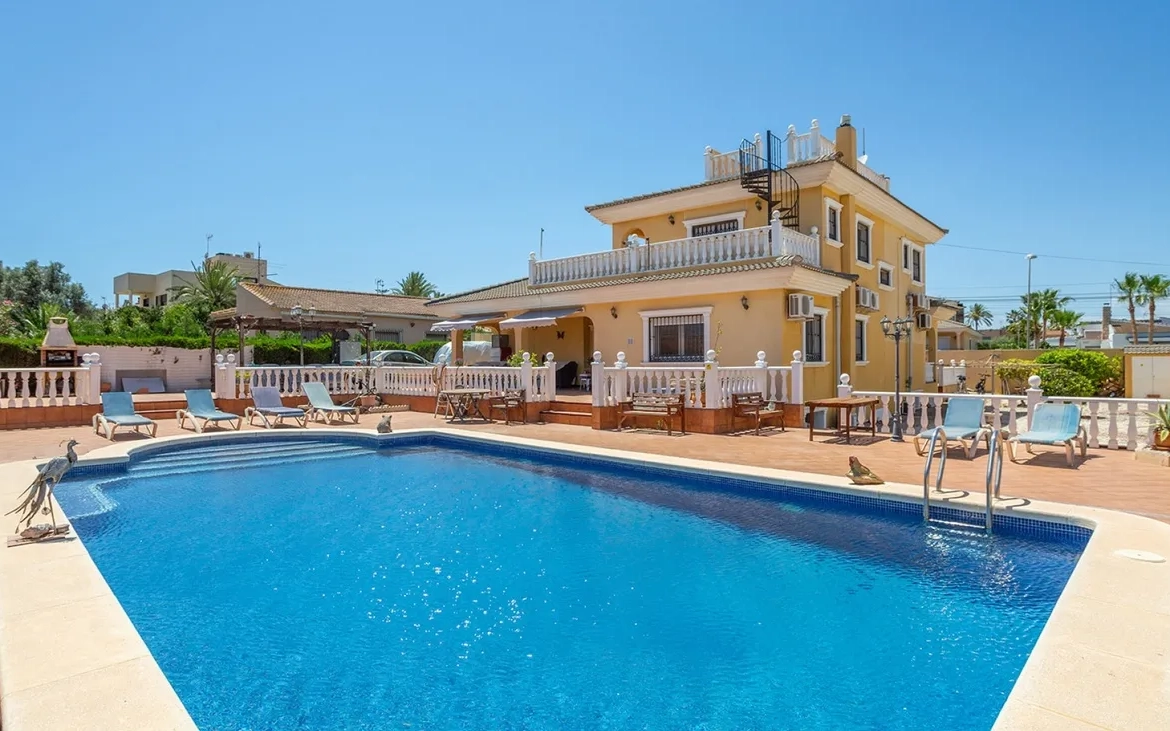 Ruime vrijstaande villa met zes slaapkamersLocatie en omgevingGelegen op een perceel van 1.040 m² in de exclusieve wijk Los Balcones in Torrevieja. Deze villa bevindt zich op loopafstand van restaurants, winkels en cafés en ligt slechts enkele minuten van het strand en diverse golfbanen.Indeling en kenmerkenDe woning is verdeeld over drie niveaus met een privé dakterras dat een indrukwekkend 360° uitzicht biedt. De hoofdverdieping bevat een lichte woonkamer met open haard, een grote moderne keuken met eetruimte, een bijkeuken, twee slaapkamers met eigen badkamer en een luxe familie badkamer met jacuzzi. De bovenverdieping heeft twee extra slaapkamers met eigen badkamer en toegang tot een zonnig terras dat leidt naar het solarium. De ruime onderbouw heeft twee extra slaapkamers, waarvan één voorbereid is voor een badkamer, ideaal voor gasten of als extra woonruimte.BuitenruimteBuiten beschikt de villa over een privé zwembad van 60 m² met een jacuzzihoek, meerdere eetterrassen, onderhoudsarme tuinen met fruitbomen en parkeerplaats voor maximaal vier auto’s. Extra voorzieningenDe woning is voorzien van airconditioning, vooraf geïnstalleerde centrale verwarming, beveiligingscamera’s, sensorverlichting, een elektrische opritpoort en dubbel glas.