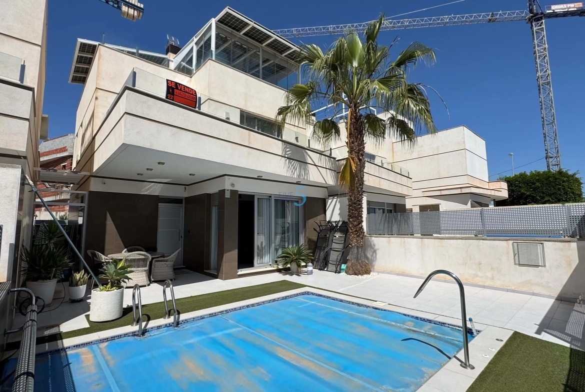 5 Real Estate is delighted to market this stunning detached, 3-bedroom, 3-bathroom villa in Lomas de Cabo Roig. The property has a private pool, garden, and a solarium with stunning views, and is close to local amenities.