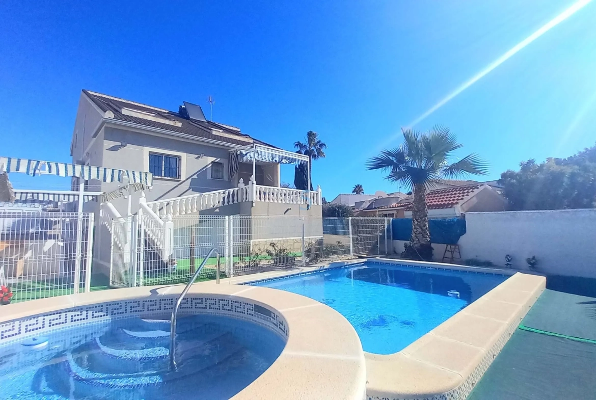 This impressive 6-bedroom, 3.5-bathroom detached villa in El Chaparral offers generous living space, ideal for families or those looking for a home with additional guest accommodation. Situated close to amenities, the property features a private driveway and a large garage with space for two cars. The southwest-facing back garden is perfect for outdoor living, boasting a private pool, terraced seating area with toldos, a BBQ, and a large storage room.